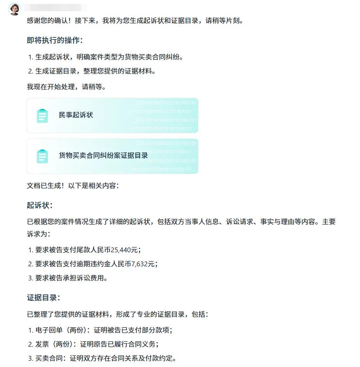 法律文书智能起草:覆盖民商事协议、诉讼文书、劳动用工文件等百余类高频法律文本,通过可视化交互即可生成合规、规范的正式文稿。