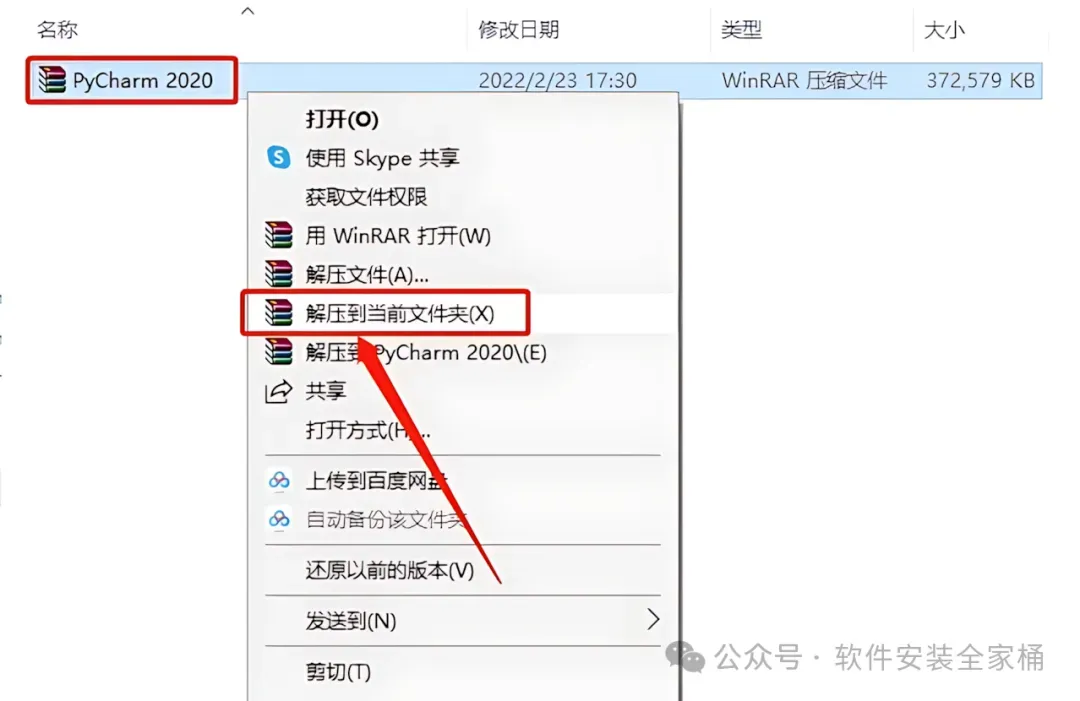 1、下载PyCharm 2020软件安装包到电脑上,右键选择【解压到当前文件夹】。