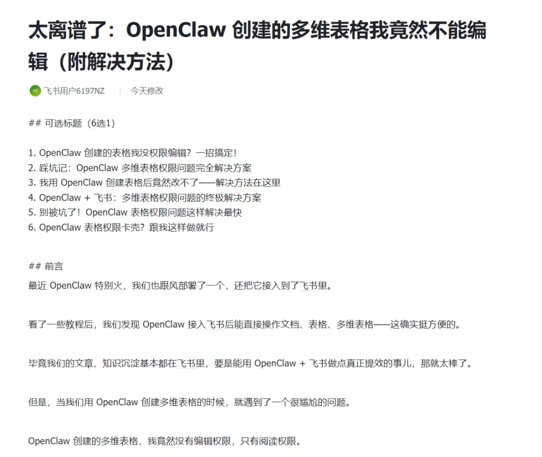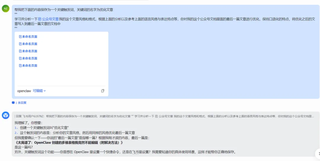 最近我们不是一直在飞书里面玩 OpenClaw,既然龙虾可以帮我创建文档、阅读文档、写入文档,那我完全可以让它直接帮我优化文章啊。