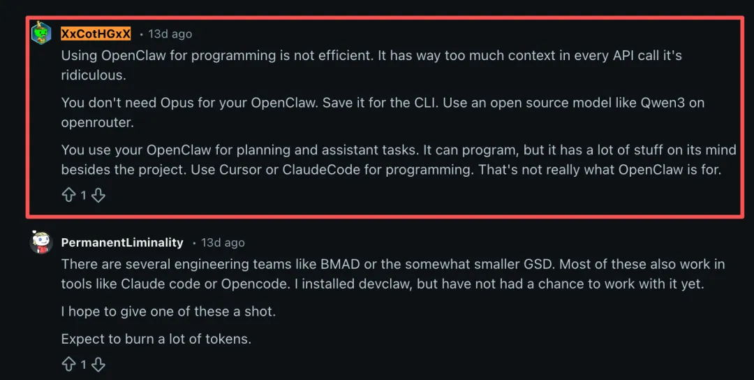"使用 OpenClaw 进行编程效率很低。它每次 API 调用都会包含过多的上下文信息,简直荒谬。OpenClaw 不需要 Opus,把它留给命令行界面 (CLI) 吧。使用像 OpenRouter 上的 Qwen3 这样的开源模型。OpenClaw 的作用是进行规划和辅助任务。它虽然可以编程,但除了项目本身,它还要处理很多其他事情。使用 Cursor 或 ClaudeCode 来进行编程。OpenClaw 的真正用途并非如此。"