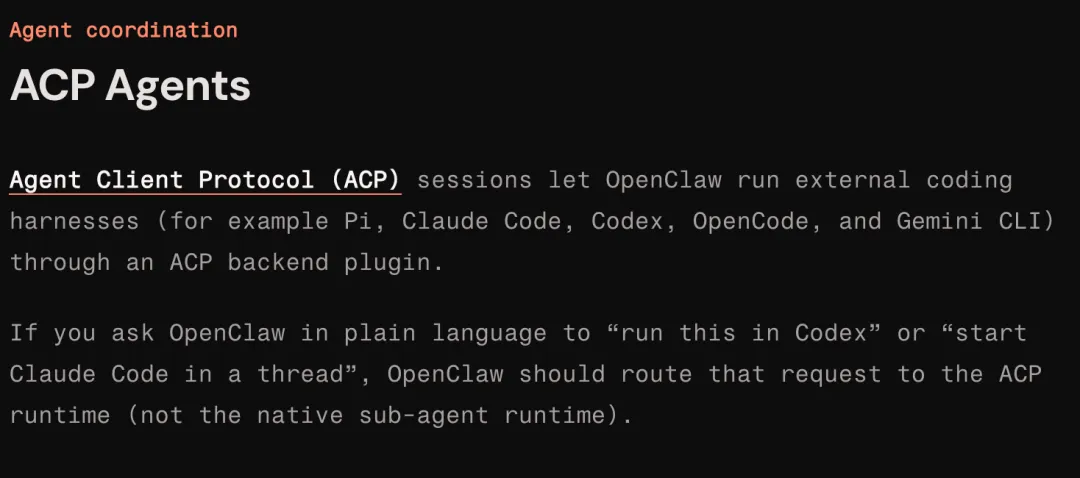 最近的版本里,它可以调用外部工具 ACP来完成任务。虽然自己也能写点代码,但它知道这不是强项——所以会把编程交给更合适的工具。
