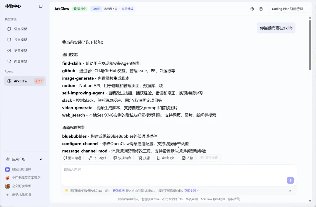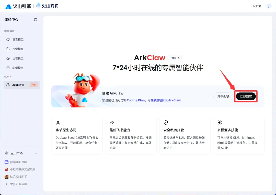 这里我用 ArkClaw 做简单示例,因为我有字节的方舟 Coding Plan Lite,首月9.9,可以体验七天 ArkClaw。