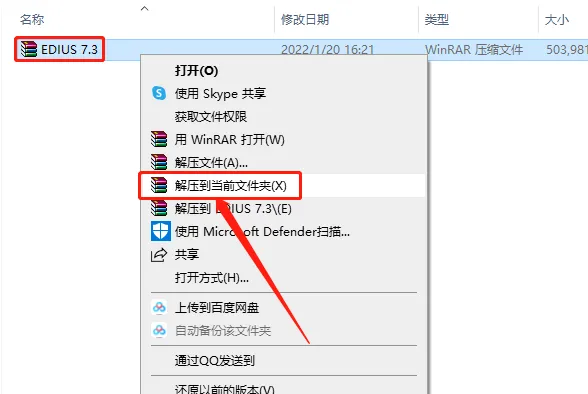 1.打开下载的EDIUS软件安装包,鼠标右击压缩包选择【解压到当前文件夹】。
