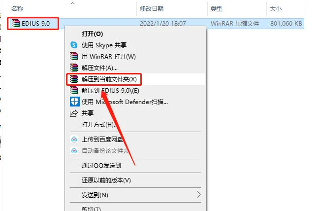 1.打开下载的EDIUS软件安装包,鼠标右击压缩包选择【解压到当前文件夹】。