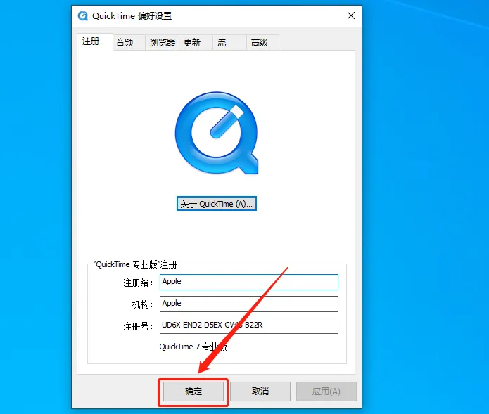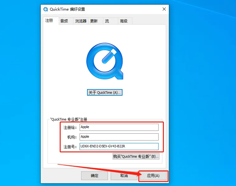 14.注册机和机构处填写:Apple,注册号处填写:UD6X-END2-D5EX-GV43-B22R,然后点击【应用】。