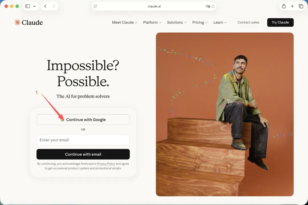 1. 打开 claude.ai[1],选择「用 Google 登录」,按提示操作即可