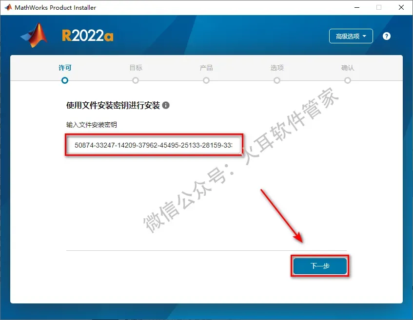 6.在输入文件安装密钥输入:50874-33247-14209-37962-45495-25133-28159-33348-18070-60881-29843-35694-31780-18077-36759-35464-51270-19436-54668-35284-27811-01134-26918-26782-54088,点击“下一步”