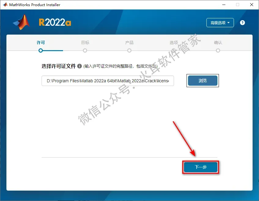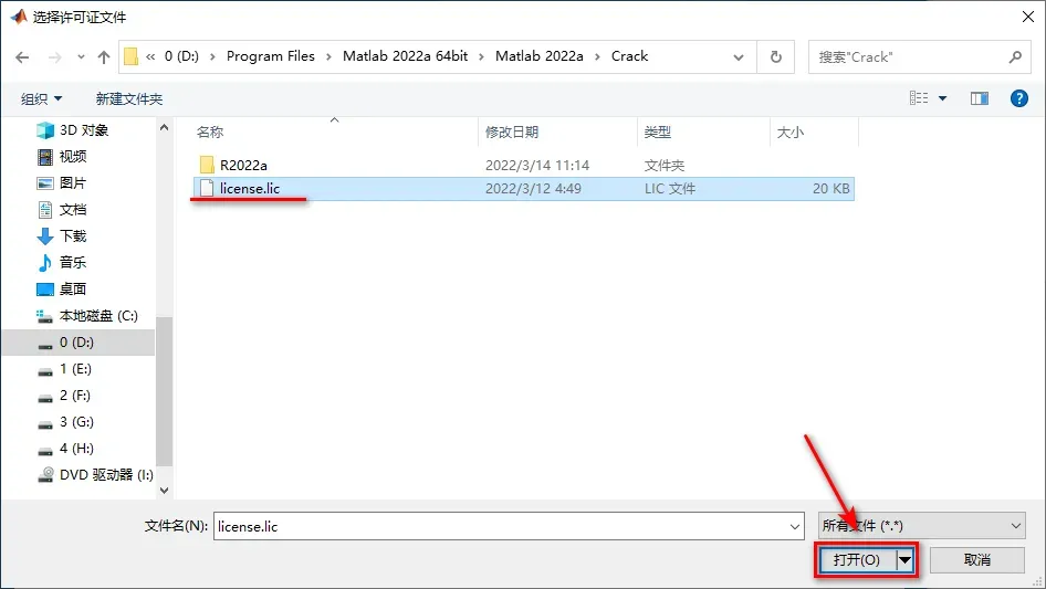 8.在解压后的文件夹Matlab 2022a文件夹中的【Crack】文件夹,选中license.lic文件,点击“打开”