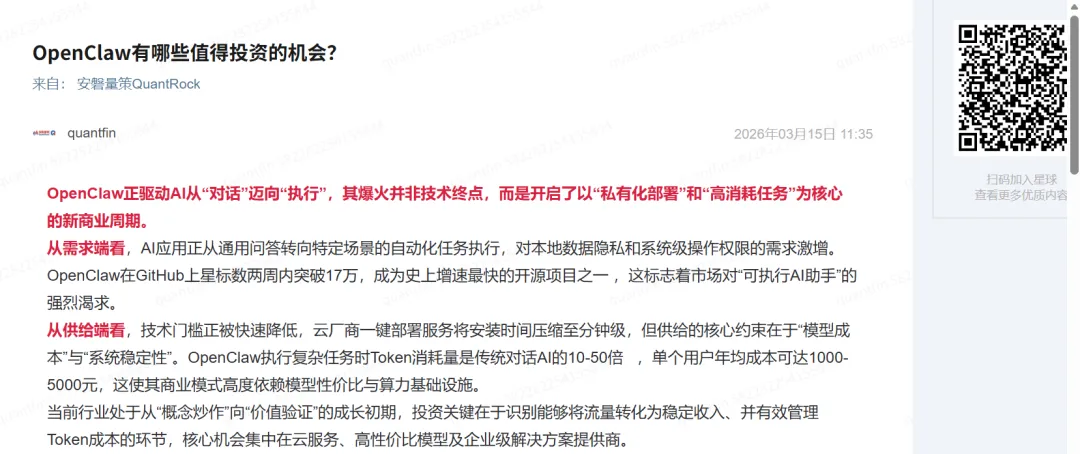 从供给端看,技术门槛正被快速降低,云厂商一键部署服务将安装时间压缩至分钟级,但供给的核心约束在于“模型成本”与“系统稳定性”。OpenClaw执行复杂任务时Token消耗量是传统对话AI的10-50倍 ,单个用户年均成本可达1000-5000元,这使其商业模式高度依赖模型性价比与算力基础设施。