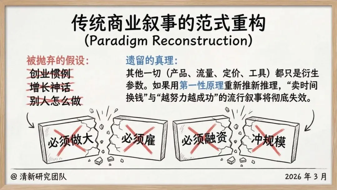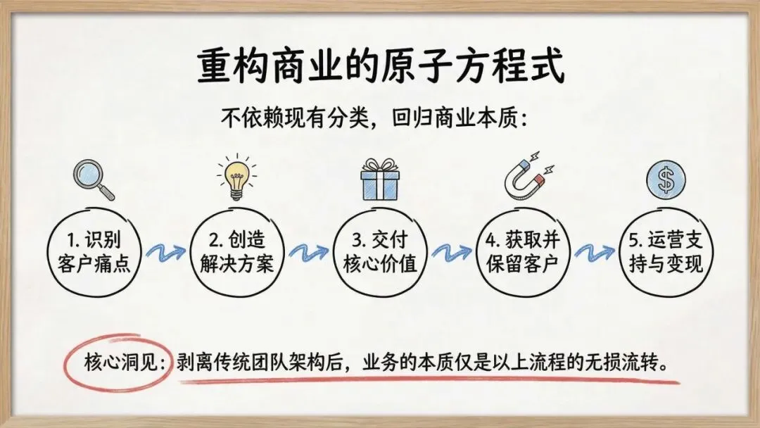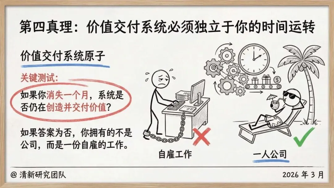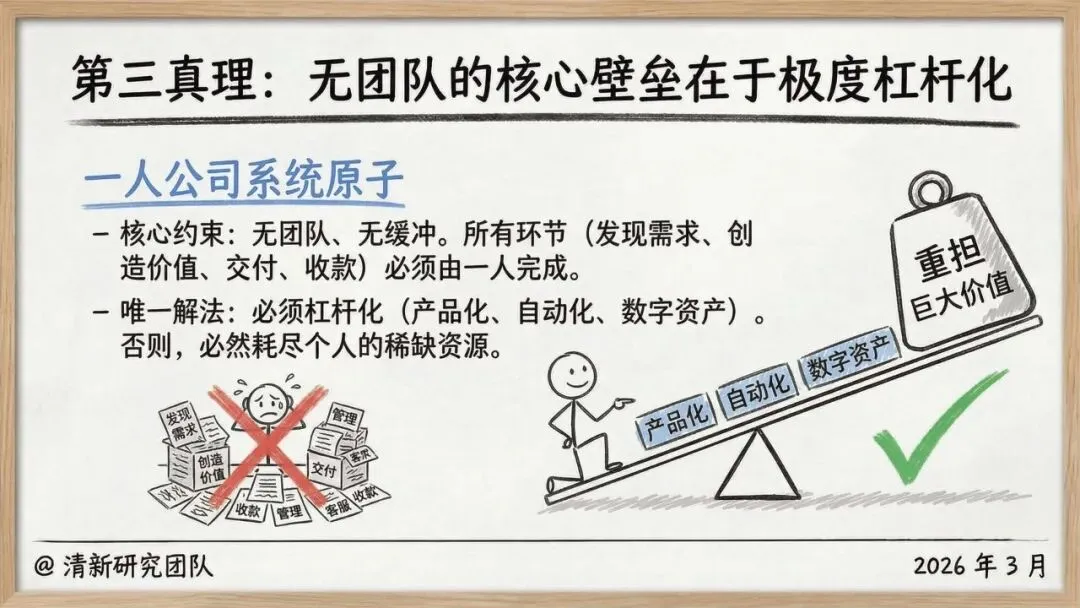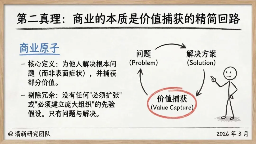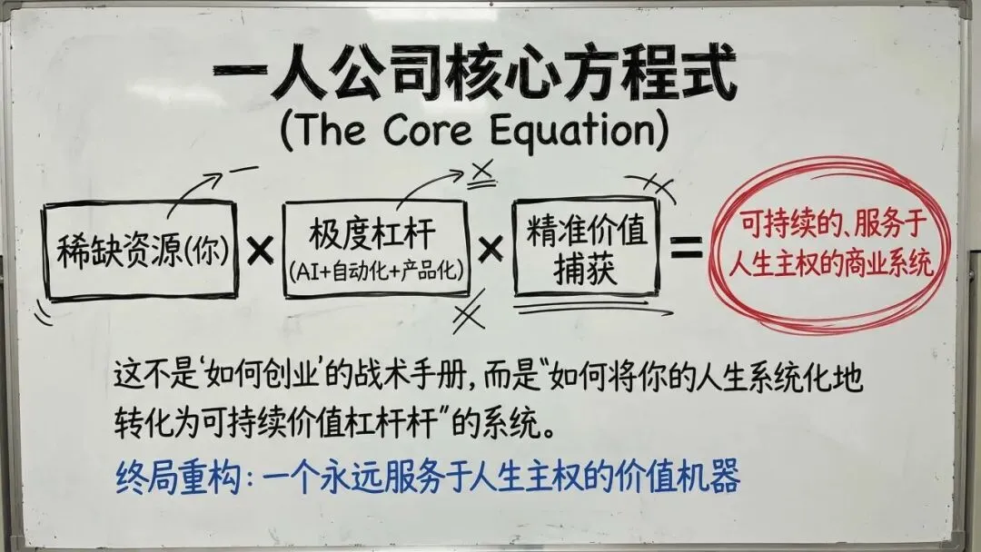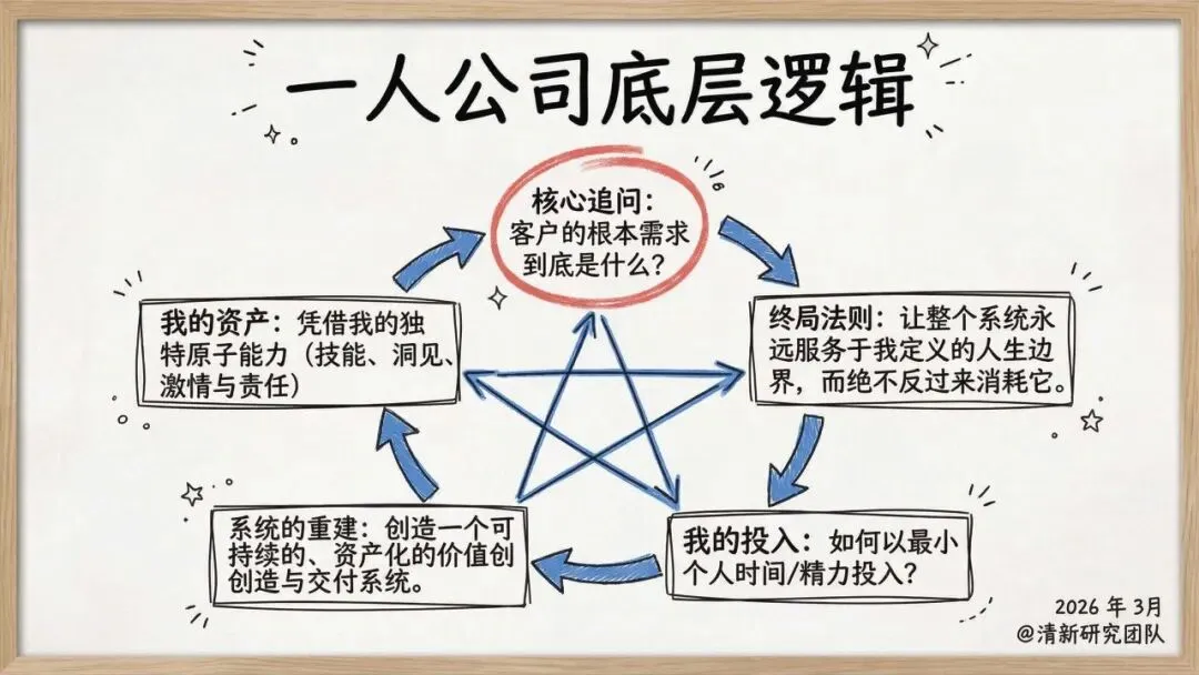 1. 核心范式重构一人公司的第一真理是创始人本身是系统中唯一稀缺的资源(时间、精力、注意力)。商业的本质被简化为一个原子回路:为他人解决根本问题并捕获价值,剥离了“必须扩张”的传统叙事。