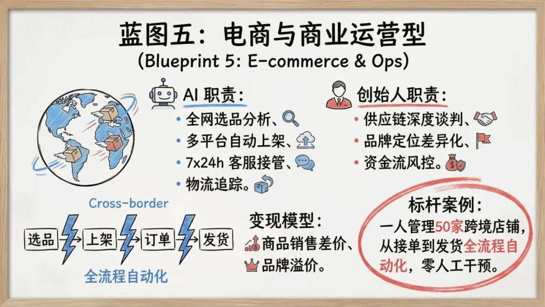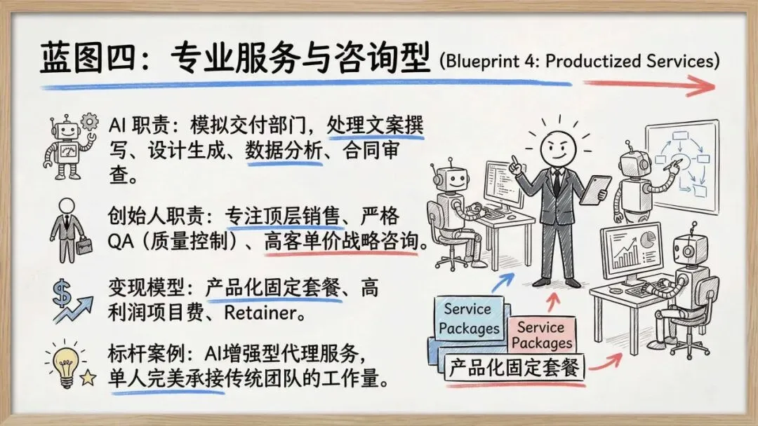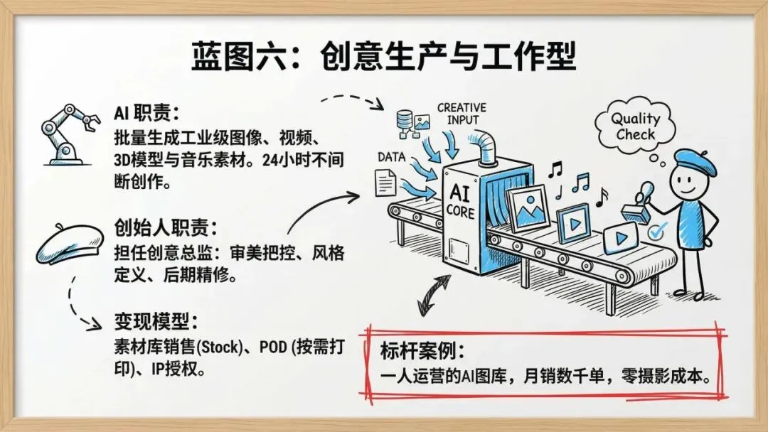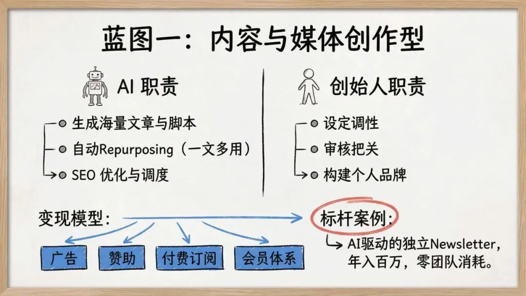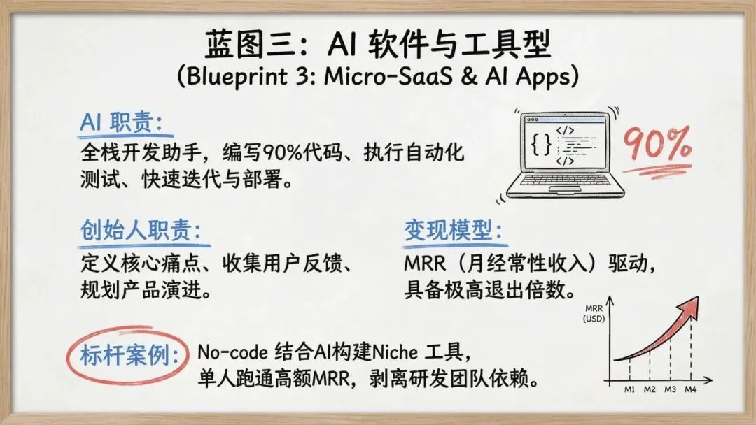 2. AI驱动的六大蓝图AI作为核心杠杆,突破了个人的物理瓶颈。报告提出了六种一人公司蓝图:内容与媒体创作、数字信息产品、微SaaS软件工具、专业服务咨询、电商运营及创意生产。每种模式都清晰界定了AI(执行/生成)与创始人(把控/销售)的职责分工,并构建了从内容变现到月经常性收入(MRR)的多种盈利模型。