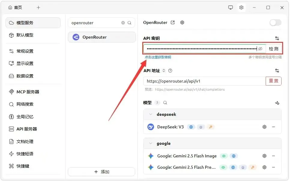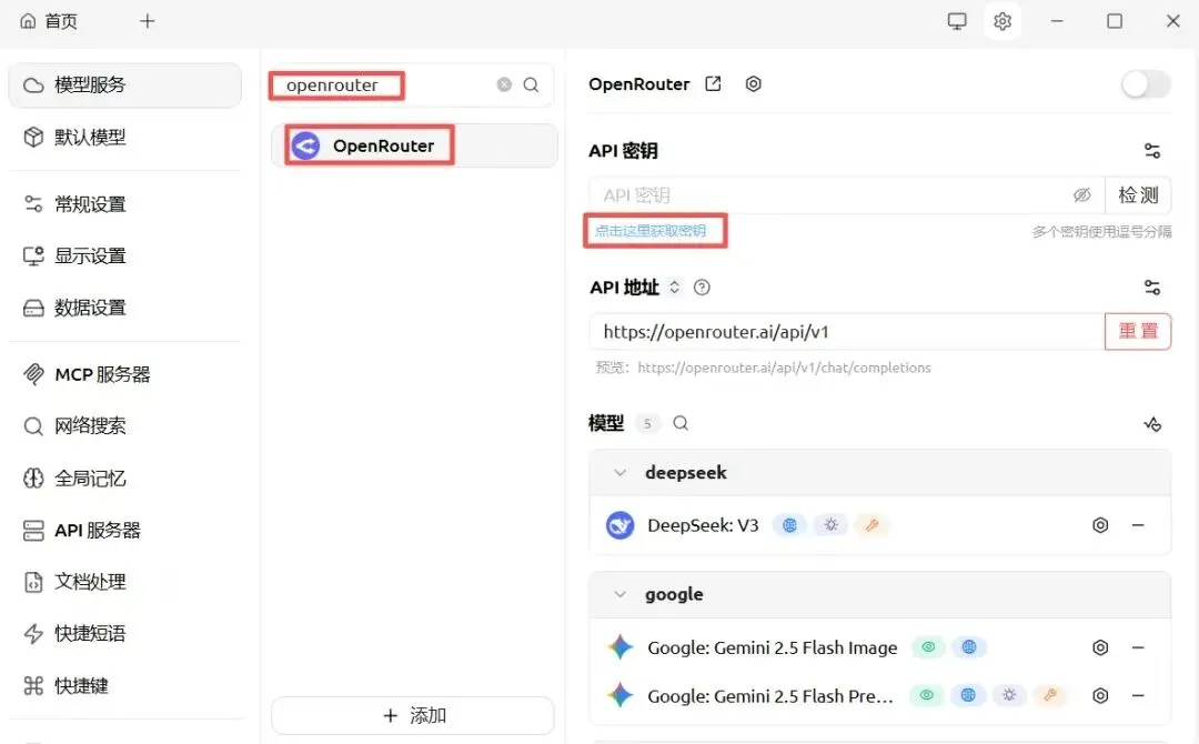 2.在设置搜索框里,输入【openrouter】,然后按下回车键(Enter 键),接着点击【获取密钥】;