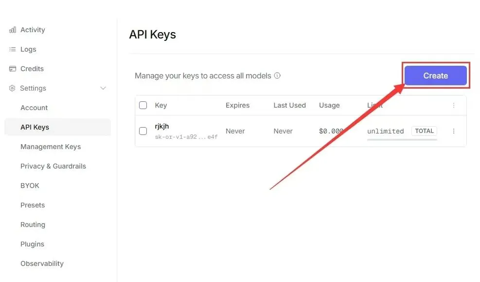 4.登录后,点击页面上的【Create】,创建一个 apikey(记好这个密钥,后面要用);