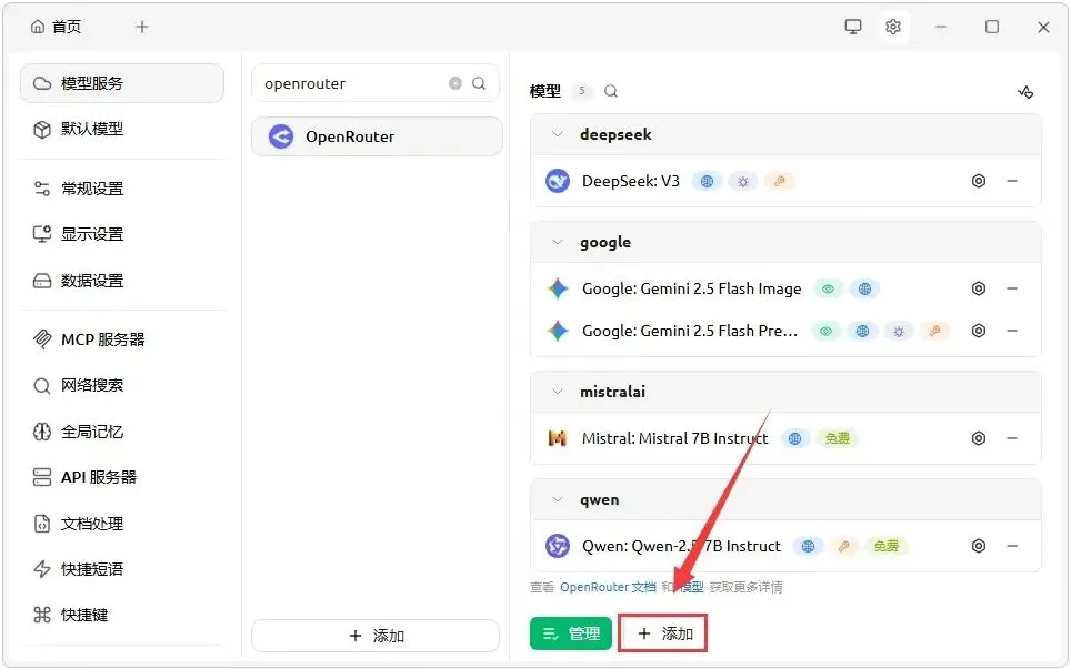 6.往下滑动页面,找到 “添加” 按钮,点击一下; 7.在弹出的框里,输入【stepfun/step-3.5-flash:free】,然后点击 “添加模型”;