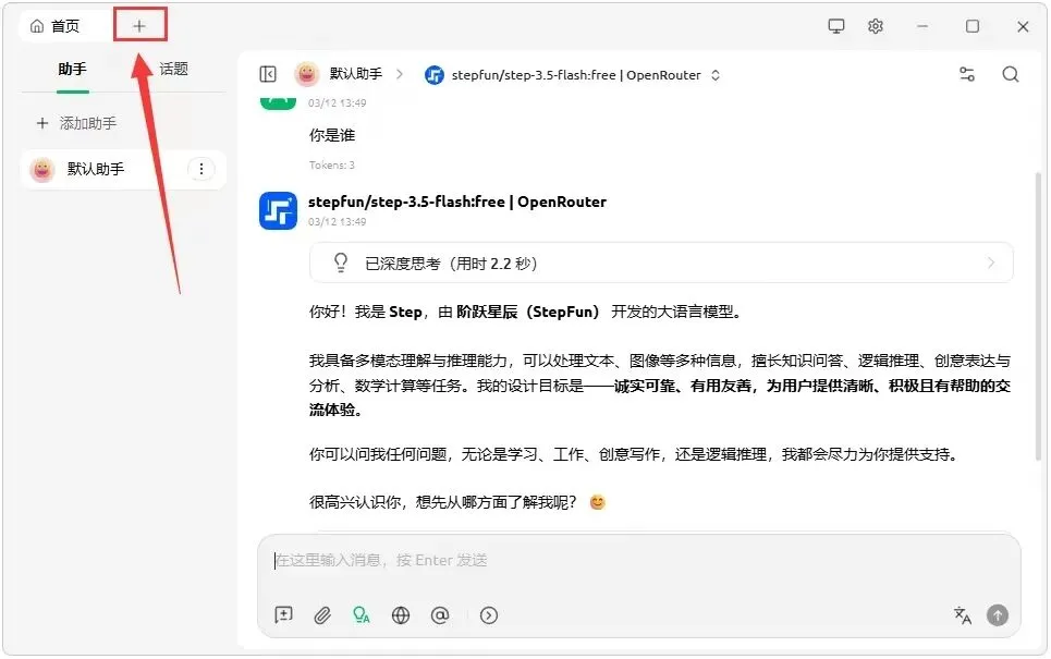 1.还是在 Cherry Studio 首页,点击上方的加号【+】,弹出选项栏;