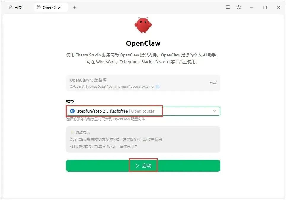 5.安装成功后,再次在模型选择栏里,选中【stepFu/step-3.6-flash:free】,然后点击【启动】;