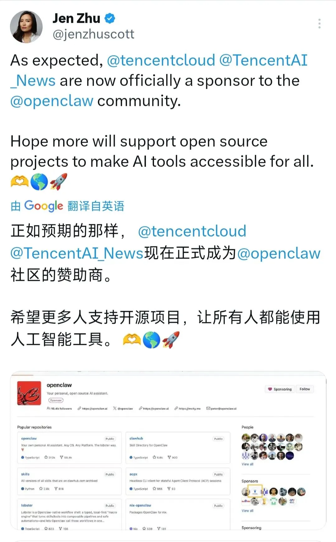 所以,腾讯成为 OpenClaw 赞助商,当然是一个重要信号。