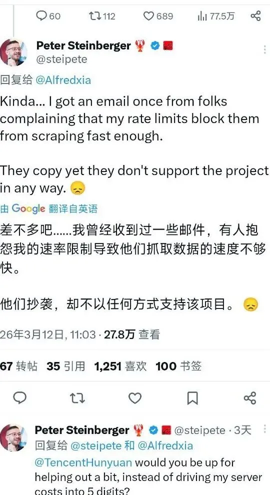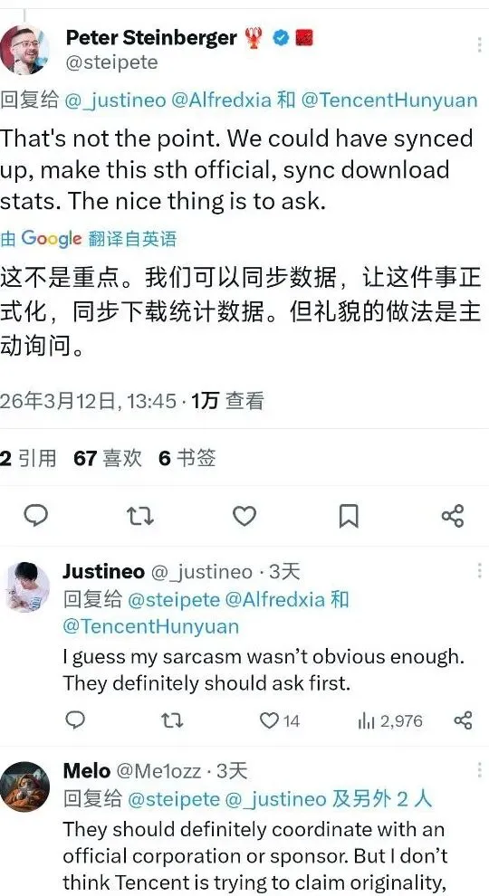 但微妙的地方在于,OpenClaw 创始人 Peter Steinberger 转发这条消息时,评论了一句: