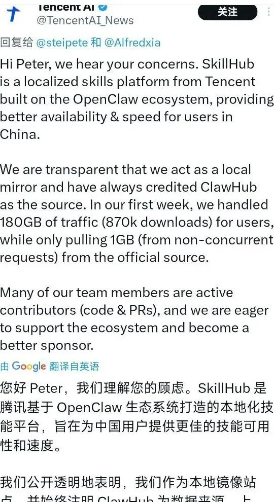 他后来还提到,如果腾讯愿意事先交流,SkillHub 甚至完全可以被纳入官方镜像体系,并同步相关下载统计。