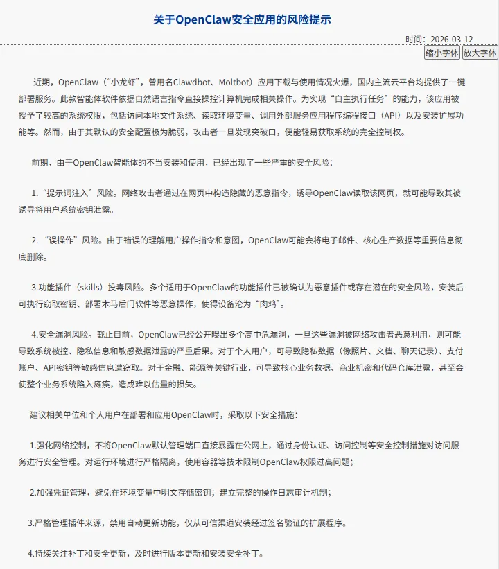 国家互联网应急中心最近发出《关于OpenClaw安全应用的风险提示》,提示严重的安全风险,里面就提到了提示词注入、误操作、插件skills投毒、安全漏洞等风险。