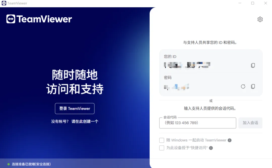 3、进入软件就能看到你这台设备的id和密码,其他人要连你的电脑,就输入id和密码即可。