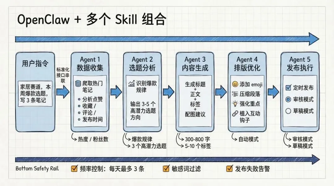 用户指令:"家居赛道,本周爆款选题,写 3 条笔记"↓Agent 1(数据收集):爬取小红书家居类热门笔记,分析点赞/收藏/评论数据↓Agent 2(选题分析):识别爆款规律,输出 3 个高潜力选题方向↓Agent 3(内容生成):针对每个选题,生成符合小红书风格的完整笔记(标题+正文+标签)↓Agent 4(排版优化):自动添加 emoji、分段、优化阅读体验↓Agent 5(发布执行):定时发布到小红书,或保存到草稿箱待审核全程不需要你动手。