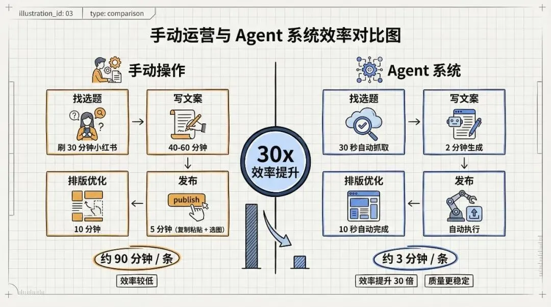 而且质量更稳定——Agent 不会累,不会心情不好,不会写出"今天随便发发"的敷衍内容。