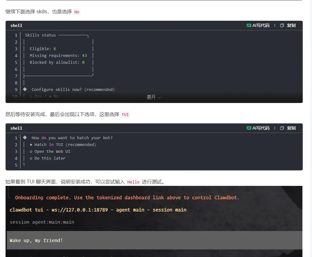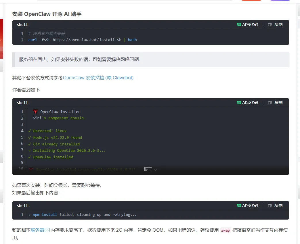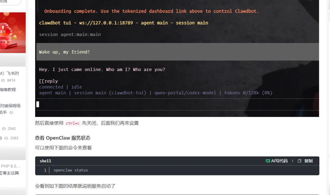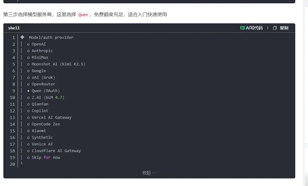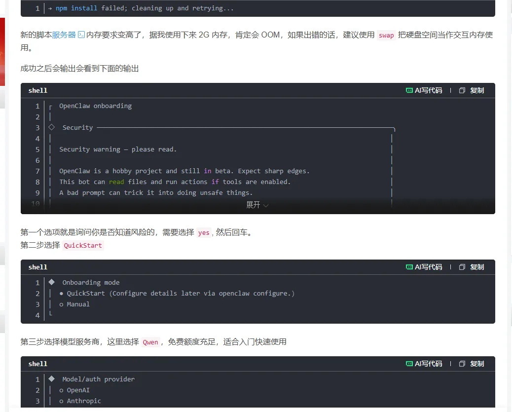 免费试用因为我不懂这个,网上也没教程。他们的教程都是直接买一个配置好openclaw的服务器。然后我就瞎蒙了一个这样就成功适用的了三个月,但是咋安装,不会,接着找教程。教程说需要一个linux系统,最好2g4核的,不懂,瞎蒙。他这个点完试用会有一个设计服务器信息的页面然后创建,但是创建成功了不知道在哪,最后乱找找到在哪打开了打开后,不懂咋办,接着搜各种教程,最后b站找到才知道,奥原来这样能操作后台,但是啥意思,不懂。没事跟着教程来教程说开始输入指令,在csdn上面找到比较详细的指令安装教学输入 curl -fsSL https://openclaw.bot/install.sh |bash因为我安装过了,所以就不输入了但是看到控制台有个一键管理,点击后,两个执行指令开始乱窜,出错!咋办,不知道,接着找教程,教程没有。但是搜关键词怎么重置显示服务器,有了。照做点进去强制停止然后再释放释放完之后,吃惊!我服务器没了,咋创建,不会。找教程好找到选完之后,花钱。完蛋!开始心慌,我刚白嫖的仨月,难过。咋办不知道,开始找教程,没找到。更难过了然后突然发现有个按钮点一下试试吧,页面似曾相识,成功,开心重复远程连接--立即登录。在想,既然有个一键管理,为啥不用点击教程,照着教程走,配置钉钉需要key。?需要key?没有,找教程,教程五花八门,看不懂,咋办,不知道,乱试发现了主页有东西,试一下免费!!! 好,开心。开始注册,注册完咋办,不知道,乱点吧。真有,开心,还找到了key接着教程往下走默认模型百炼,输入key,钉钉配置,按教程输入手机端,钉钉注册我的群聊里面,机器人。添加完毕,开心给钉钉机器人发消息,不搭理我,咋办,找教程,教程没有。扩大范围,没有。死心路线作废。开始找新路线,各种平台找教程,代码无法输入,openclaw下载失败,配置错误,不知道咋返回上一步。开始释放服务器---重建,再释放---再重建.........。n次之后已经晚上3点多了。接近奔溃,睡觉。第二天早上7点醒了,接着配置,配置成功输入指令openclaw tui,打开对话页面,成功,开心。发个你好试试。报错,401.........咋办不知道,找教程,开始,安装---出问题-----删除服务器重建-----安装---出错---..........,开始崩溃。但是坚持就是胜利,找到一个新的教程部署,输入指令下载成功第三步选择模型,卡壳。打不开Qwen咋办,找教程,最后好多说MiniMax模型好用,看看,能不能白嫖发现不行,有免费额度,没有key,不能真得花钱吧,29元/月还行,咬咬牙,试一试。MiniMax注册链接:https://platform.minimaxi.com/subscribe/coding-plan?code=FJsVb3zasg&source=link充值----心疼----复制key---接着机械式走流程到第三步选MinMax走教程选minmax_au...----cn版,具体忘了但是到这一步同样卡住了,弹不到登录页面,但是突然发现,能自己点击这个链接,手动登录。开始悔恨,我咋俺么笨,怀疑自我。接着走教程到这一步卡死,那么多平台咋没国内的,麻烦,开始找教程,巴拉巴拉巴拉吧,qq能接入???开心。怎么回退不知道,接着老办法---关闭服务器----释放删除服务器-----新建--指令欧克,又走到这一步了咋办,不知道,怎么选择找教程,没有。百度翻译有个skip for now ----跳过这一步接着走流程输入你好,欧克,成功,怎么退出来不知道,找教程没有。开始乱试/exit退出,开心接着走教程这一步卡死,怎么也成功不了,找教程,看评论,发现不影响。不管他然后此时应该是openclaw安装成功了,但是那个接入发消息的机器人那一块没成功开始想办法接入qq,