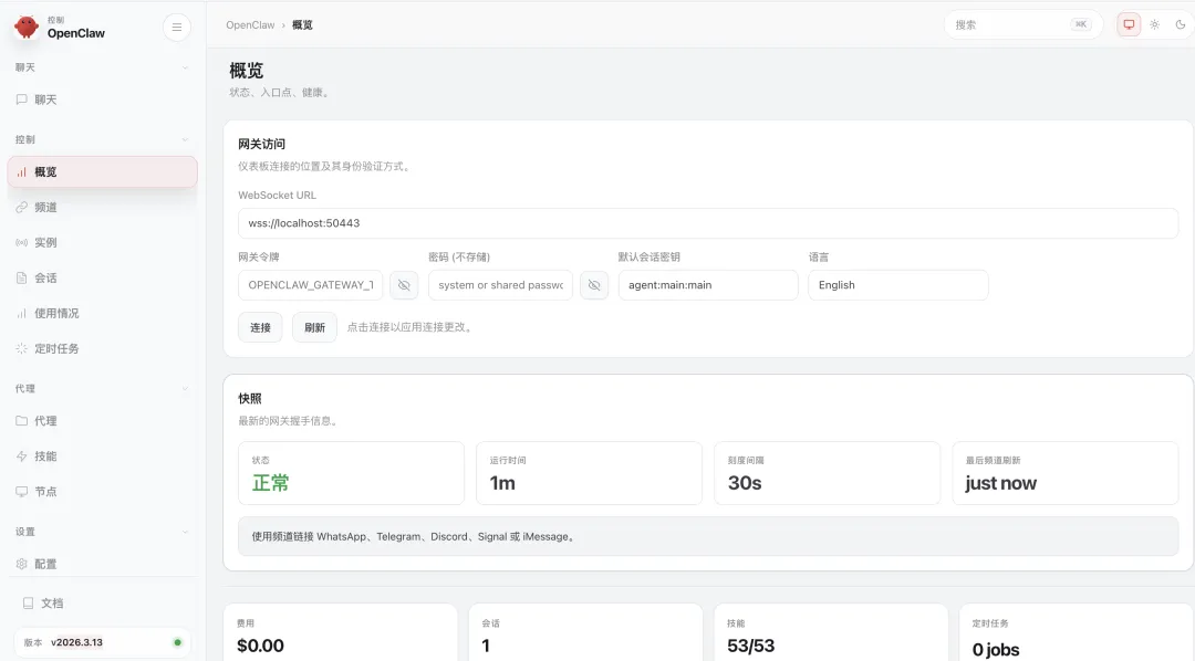 docker run -itd \ --name openclaw-in-docker \ --hostname openclaw-in-docker \ --privileged \ --restart always \ -p 443:443 -p 80:80 \ -v /lib/modules:/lib/modules:ro \ -v openclaw-storage:/var \ -v ./data/openclaw01:/root/.openclaw \ -e OPENCLAW_WEB_URL="https://localhost" \ -e OPENCLAW_USER="openclaw" \ -e OPENCLAW_PASSWORD="openclaw" \ registry.cncfstack.com/cncfstack/openclaw-in-docker:v2026.3.13-1-v0.1.2命令执行完成,即 OpenClaw 升级完成。