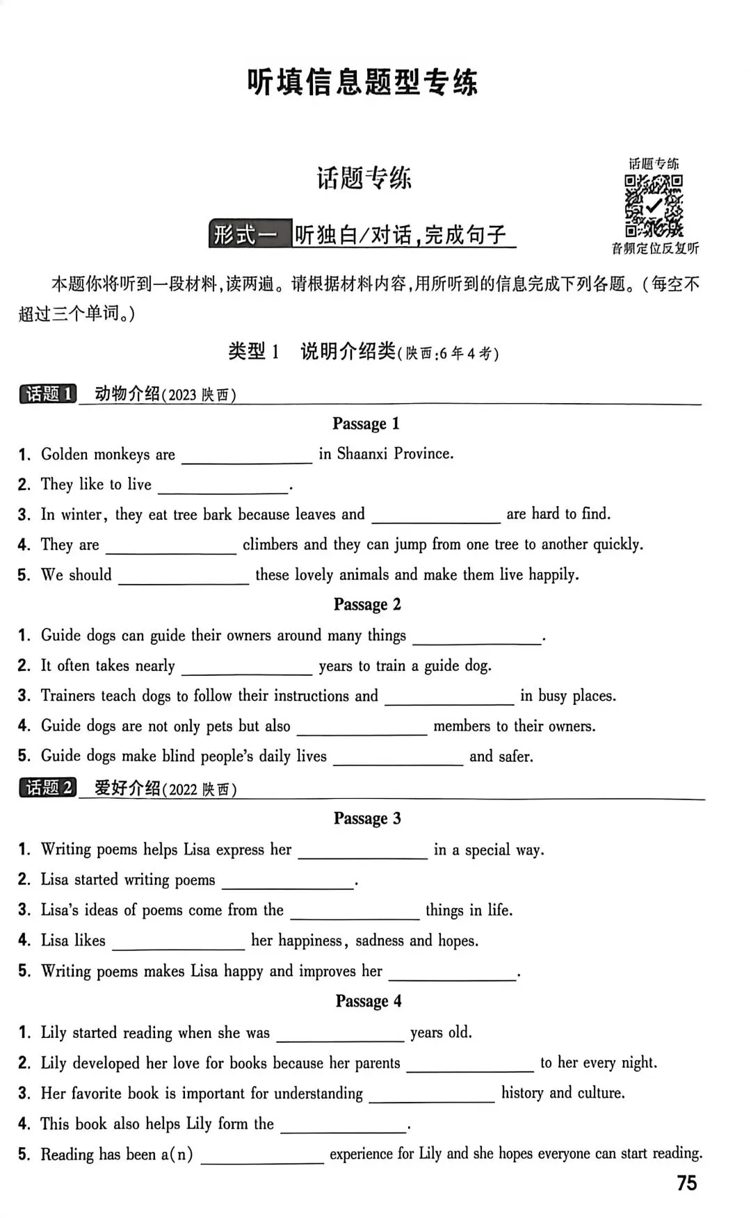 Hello, 这里是是小星星。今天给大家分享的是万唯魔耳听力的中考听填信息专练。孩子们这个题目是个弱项,需要大量的练习。我把这个单独摘出来,让学生们去练习。听力也下载下来了,如果你需要可以在文末获取。当然也建议你去书店看看你们所在地区的专版书籍,可能会有意想不到的效果。万唯的听力书我一直都很喜欢,陕西专版的也会有一些地方特色的题目,我很喜欢这个板块。