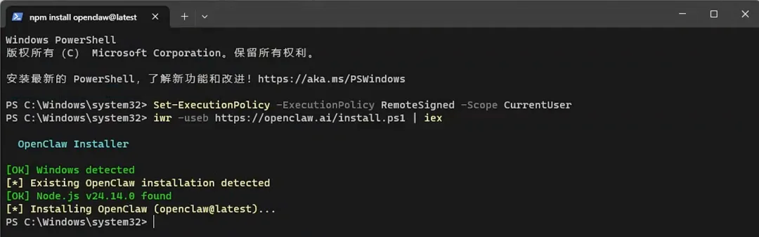5. 打开新的powershell,安装openclaw,下面命令会安装最新版本的openclaw6. 启动openclaw,注意启动了这个命令千万别关闭openclaw gateway --allow-unconfigured