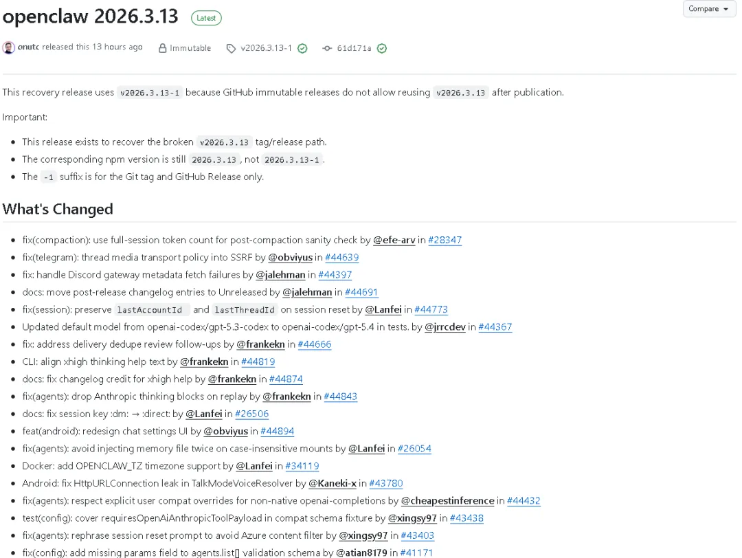 2026 年 3 月 15 日,openclaw 官方发布了 v2026.3.13-1,这是一个 不可变恢复版本(Immutable Recovery Release)。之所以采用 -1 后缀,是因为 GitHub 的不可变发布机制 不允许在已发布版本号上重新打 Tag。因此: