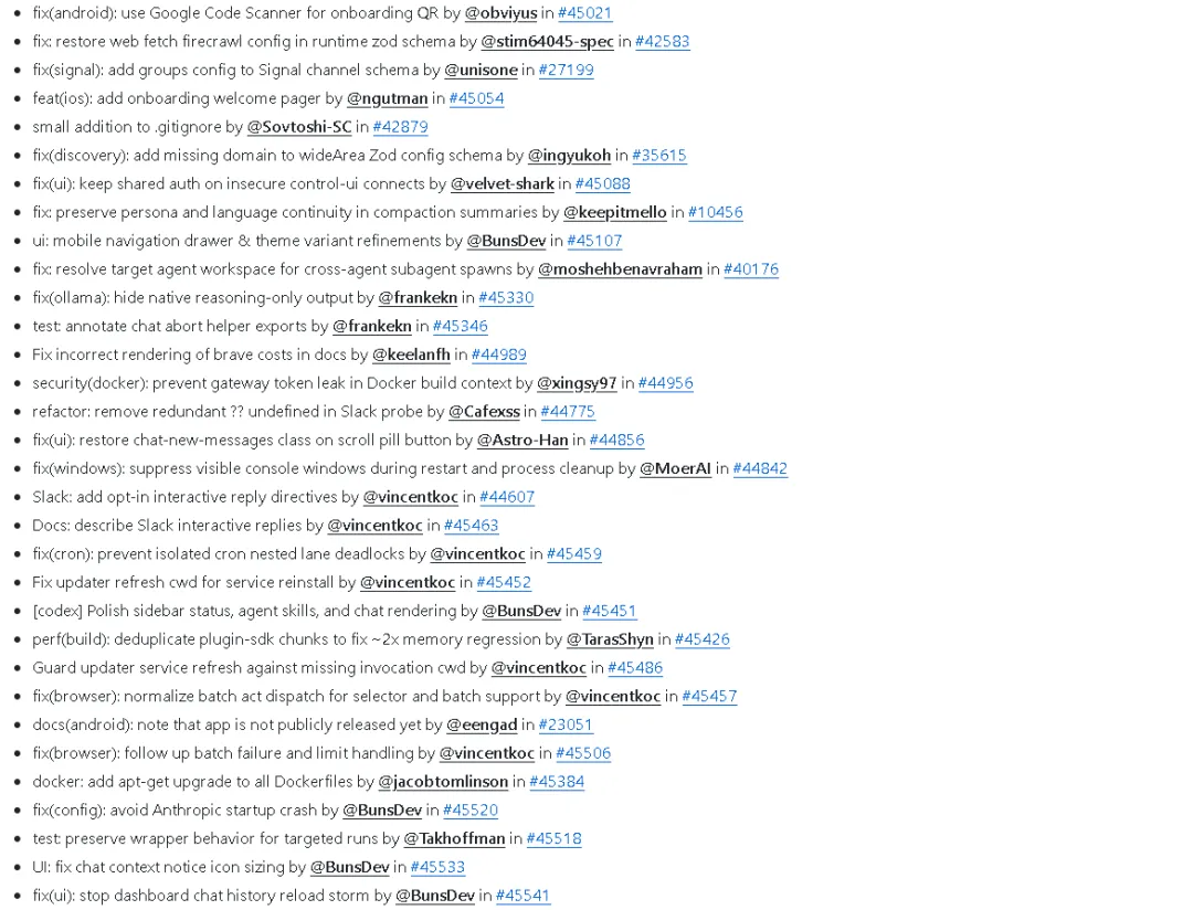 虽然这是一个“恢复发布”,但其实际内容却异常丰富,几乎覆盖了 openclaw 的 核心运行时、Agents 系统、Gateway、浏览器、移动端、Docker、安全、UI、配置、测试与文档 等所有关键模块。