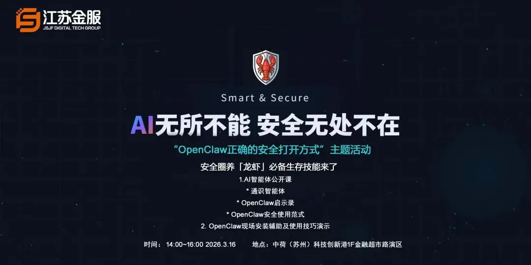 一直以来,江苏金服数字集团深耕人工智能前沿研究与产品赋能,为解决大家的使用痛点,特重磅打造“Openclaw正确的安全打开方式”主题线下活动,手把手教你安全、高效 “圈养” AI龙虾,让智能体真正成为省心的效率助手!