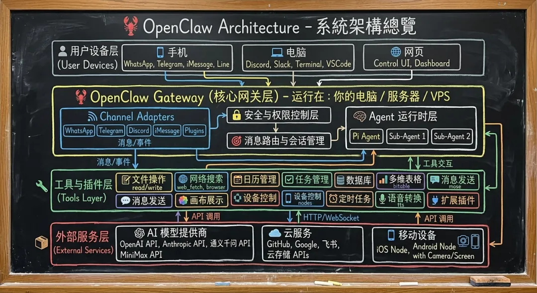 这张图展示了 OpenClaw 系统的完整四层架构,从用户设备到外部服务的全链路设计。