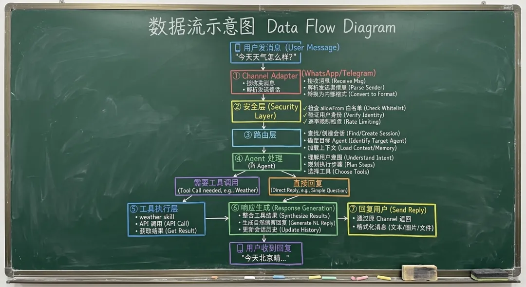 这张图展示了用户消息从发送到接收回复的完整 7 步处理流程。