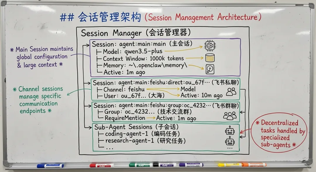 这张图展示了 OpenClaw 的会话管理器如何组织和管理不同类型的会话。