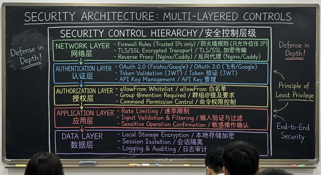 展示 OpenClaw 的五层安全控制体系。