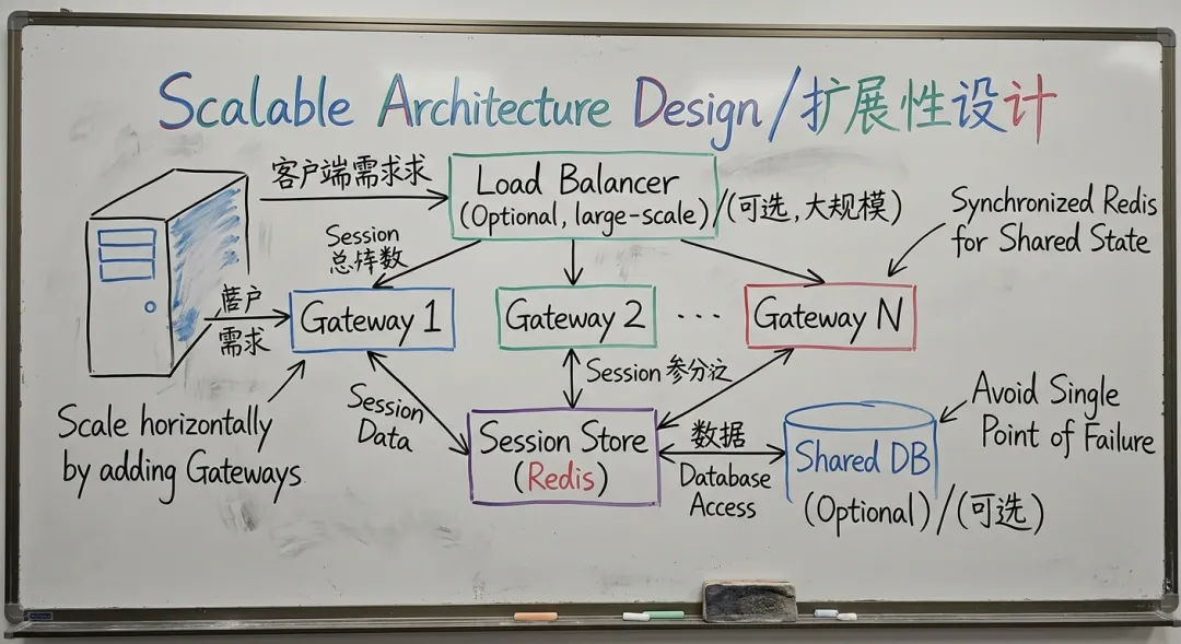 展示大规模部署时的水平扩展架构。