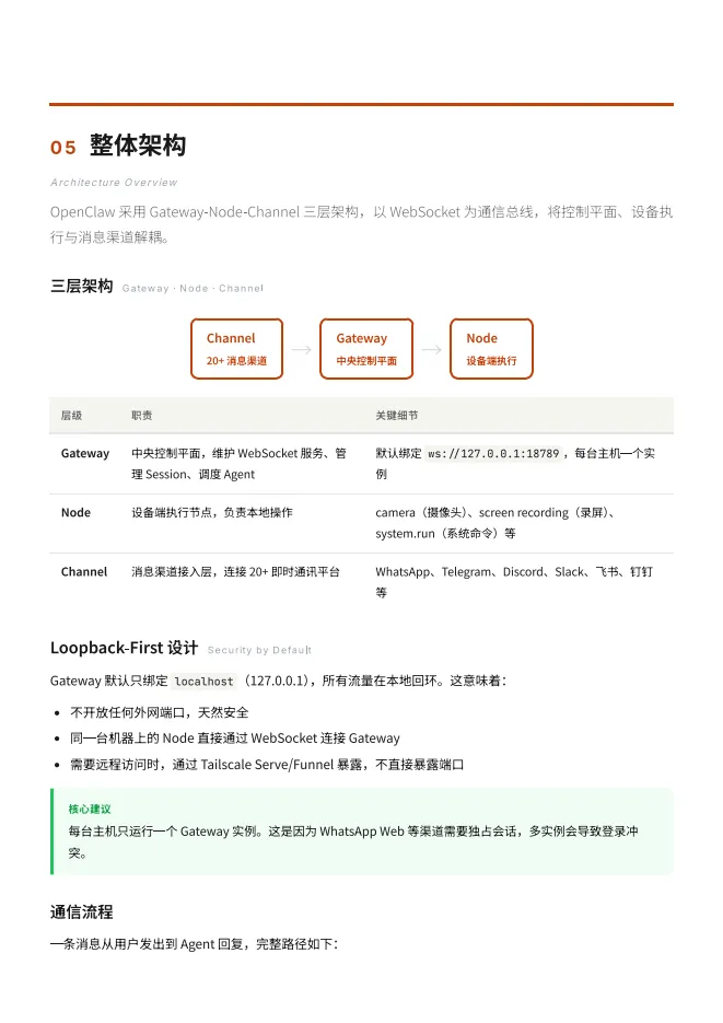 三层架构:采用 Gateway(控制平面)- Node(执行节点)- Channel(消息渠道) 的解耦设计,通过WebSocket通信,默认采用Loopback-First设计以确保安全。