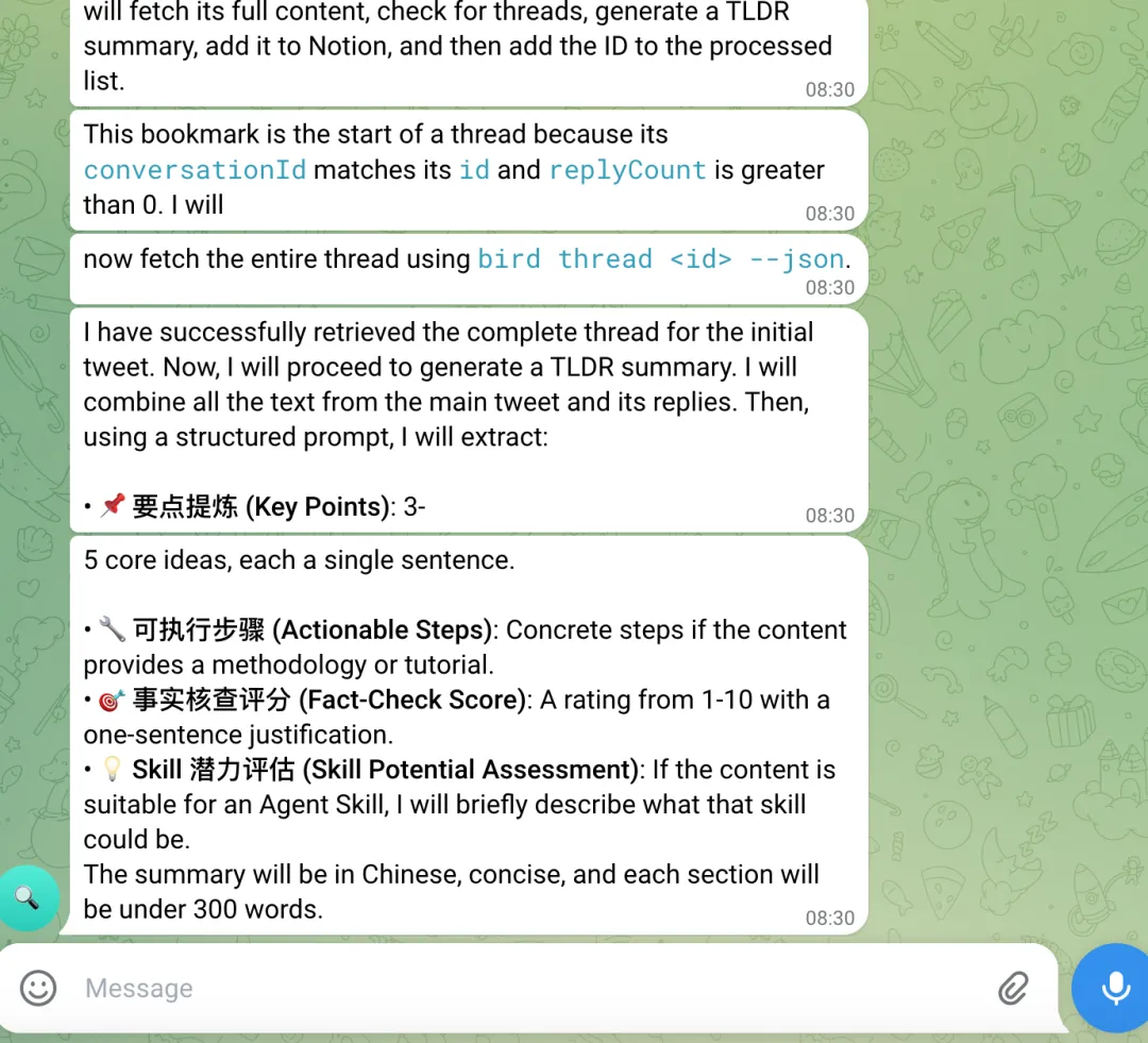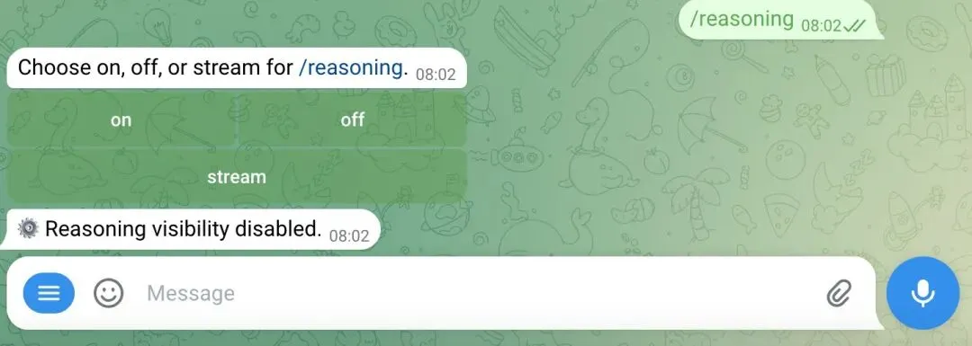 还有个小坑,Agent 有时候回复会带一大段英文的思考过程,看起来像乱码。这是模型的 reasoning 输出被发到了聊天里,在群里发 /reasoning 选 off 就行。