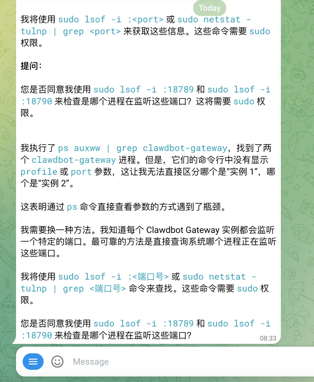 {"channels": {"telegram": {"groupPolicy": "open","groups": {"-5202339810": {"requireMention": false } } } }}这里有个坑我踩了两次:只设 groupPolicy 为 open 不够,必须加 requireMention: false。不然机器人只响应 @ 它的消息,日志里会出现 reason: no-mention,看着一切正常但就是不回你。