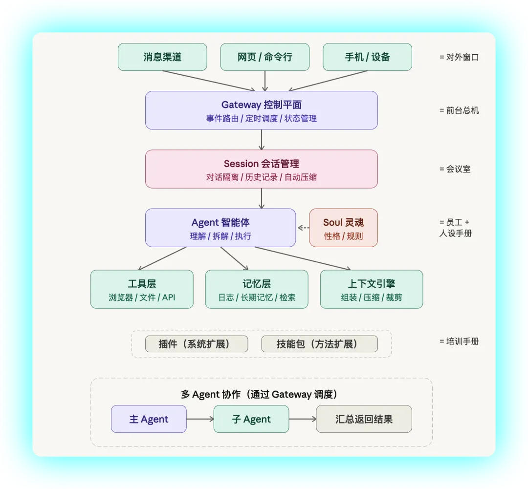 从渠道接入,到请求调度,到会话管理,到灵魂定义,到任务执行,到工具管控,到记忆存储,到上下文编排——每一层都不是多余的。