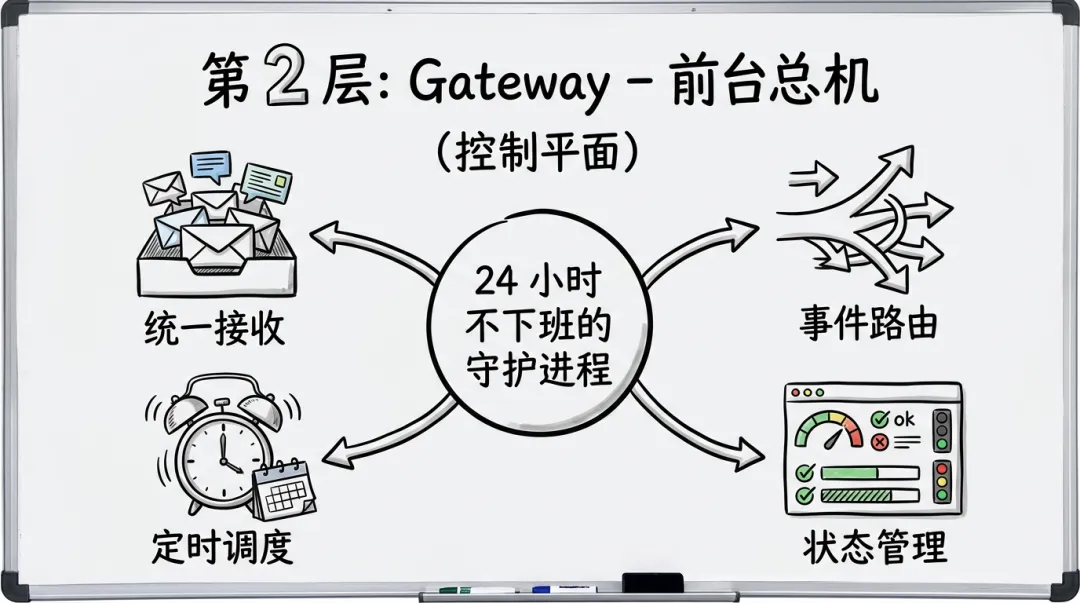 Gateway 是一个常驻运行的守护进程(可以理解为 24 小时不下班的前台),做四件关键的事: