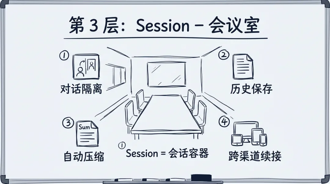 为什么重要? 没有 Session 管理的 Agent,就像一家公司没有会议室——所有对话在大厅里喊,谁都能听到,没人记得上次说了啥。Session 是 Agent 从"玩具"变成"可用系统"的基础设施。