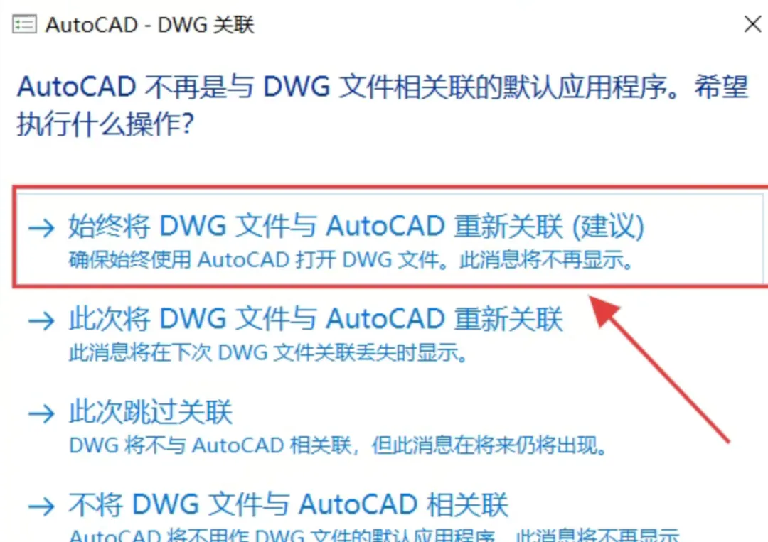 18.如果有这个弹窗就点击始终将DW文件与AutoCAD重新关联选项,没有就不用管