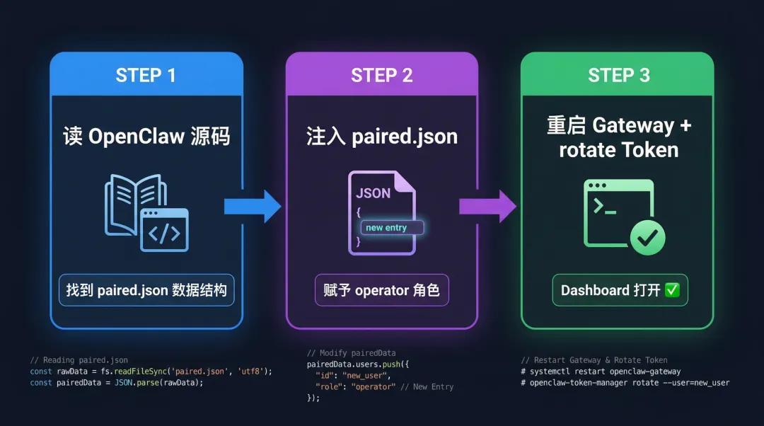 步骤一:从 OpenClaw 源码里找到 paired.json 的数据结构(~/.openclaw/devices/paired.json),确认 deviceId 的格式和必要字段。