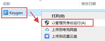 6、选中【Keygen】程序,鼠标右键点击【以管理员身份运行】。(如果打开没有看到有这个程序,是电脑杀毒软件和防火墙拦截删除了,关掉重新解压即可.)