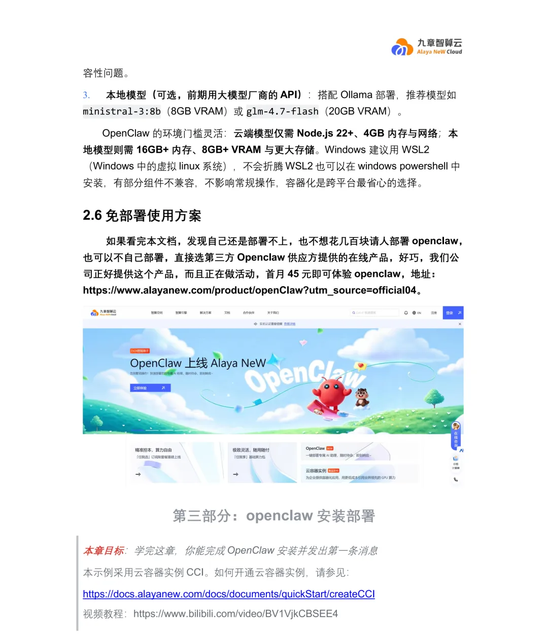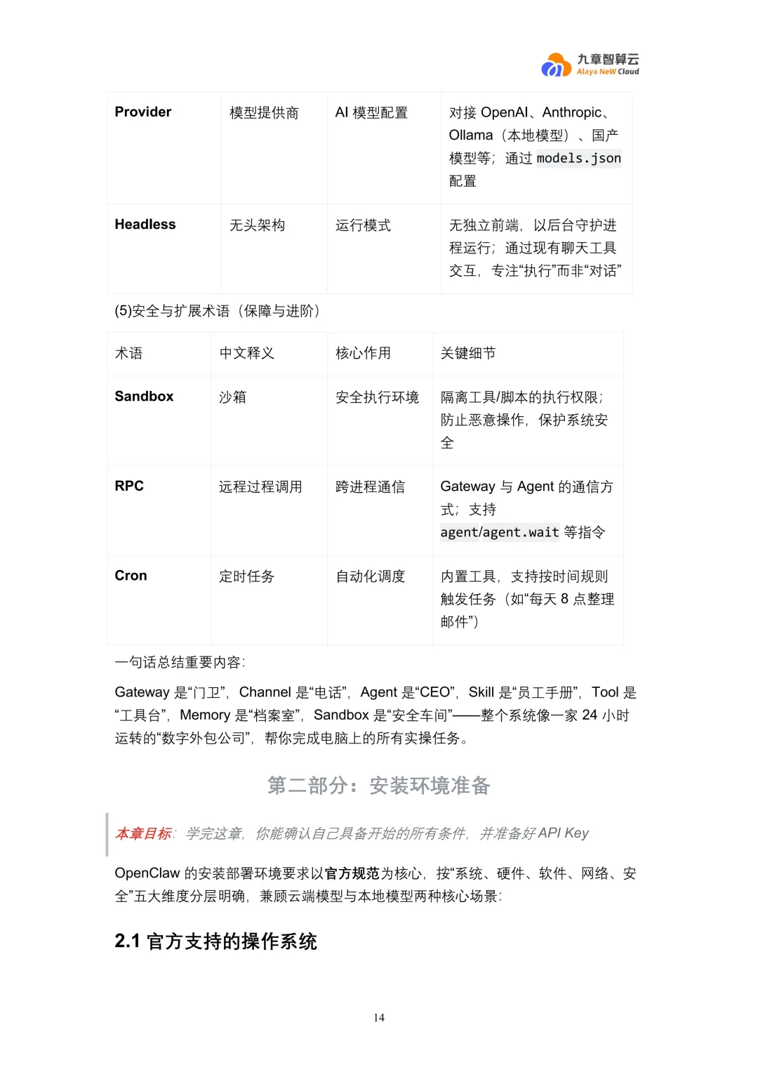 OpenClaw 简介 -> 安装环境准备 -> 安装部署 -> 接入飞书与微信 -> 安全增强 -> 大模型配置 ->Skill 的安装、创建与使用等。