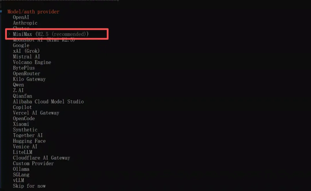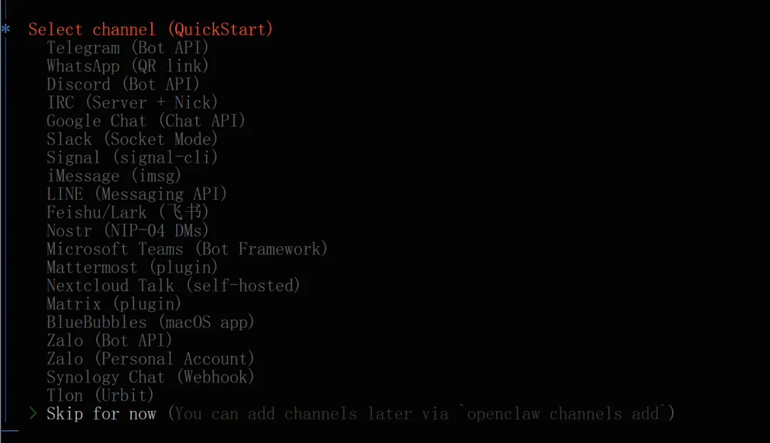 这里我们直接选最后一个跳过,因为国外的平台没法直接使用,国内使用QQ最方便。因为QQ官方平台已经支持小龙虾。